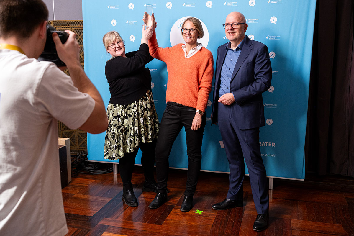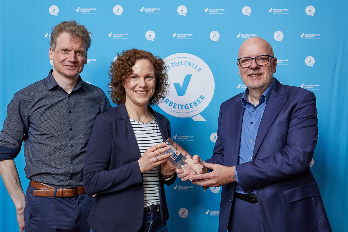 Bei der Verleihungsfeier des Arbeitgebersiegels am 11. März 2026 nutzten die Siegelträger die Gelegenheit, sich mit der Trophäe fotografieren zu lassen.